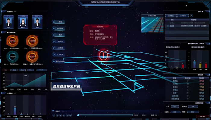 用于矿井、隧道施工等危险作业场景的救援,通过各种信息数据计算疏散路径,生成智能应急广播指导人员疏散。