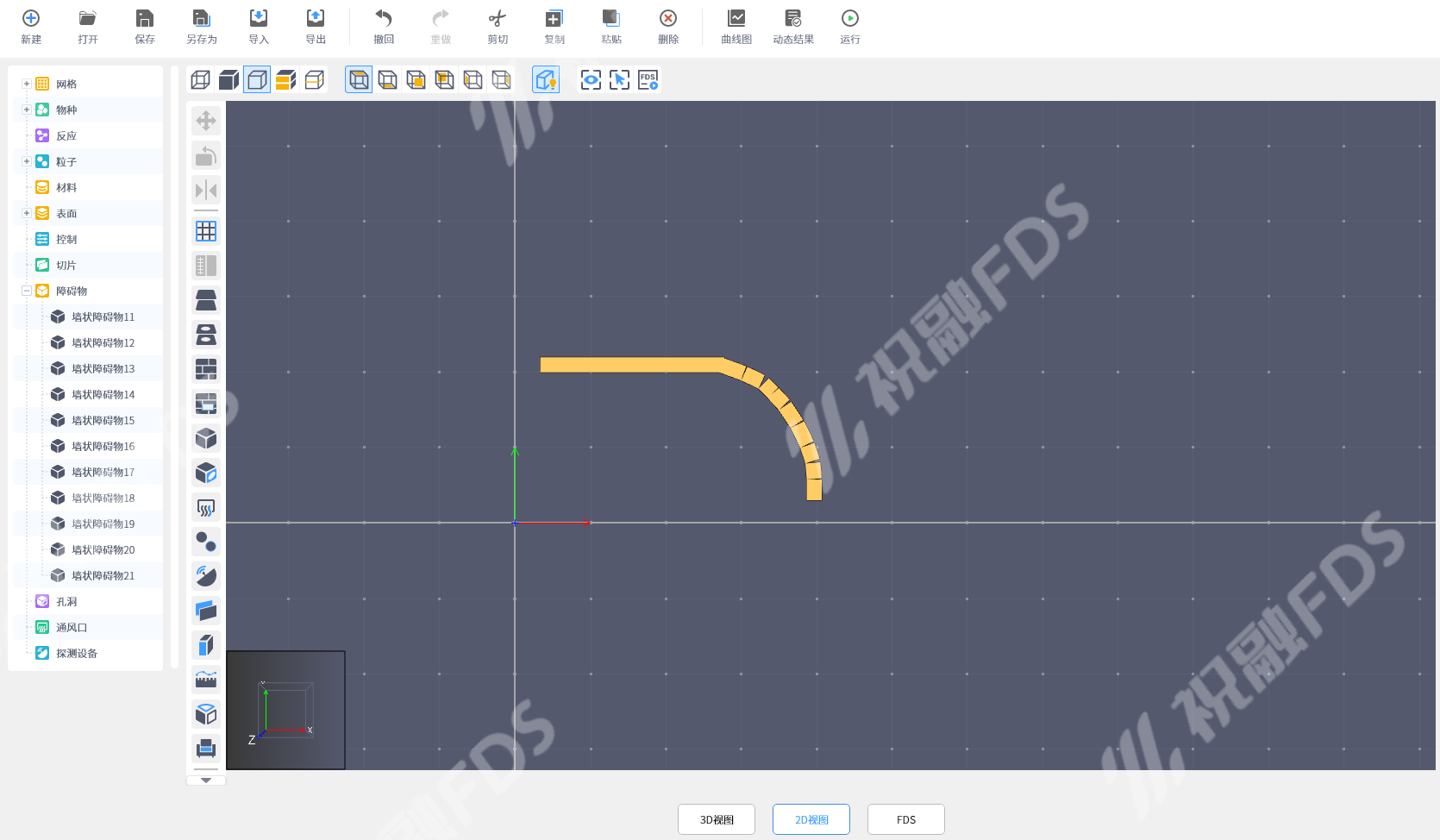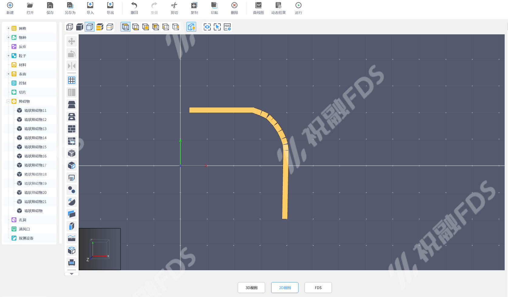 虽然祝融FDS没有专门创建曲面墙的工具,但我们仍可以通过以下方法近似创建曲面墙: