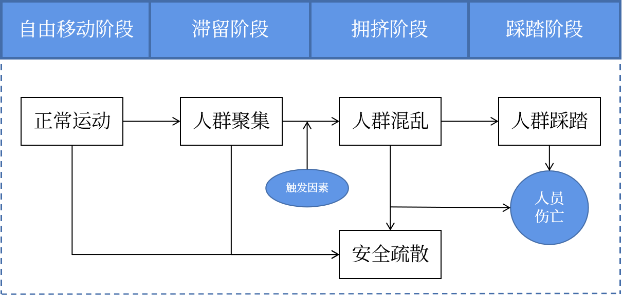 踩踏事故发生过程是指人群从稳静状态到踩踏事件爆发的整个过程。踩踏事件的发生过程可以分成四个阶段: