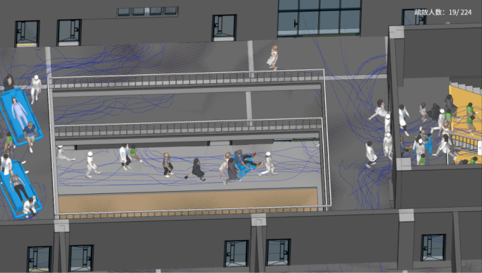 系统生成直观易懂的3D动画,清晰展示疏散过程,便于直观理解与分析,为优化疏散路径提供直观依据。